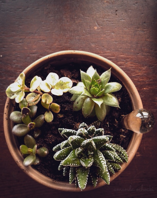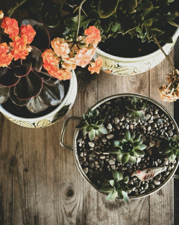 It’s getting warmer and when the funny orange plant I wintered upstairs in my little sunlit studio blooms indoors, it’s time for it to move out. There’s a fussy porch collection starting ..I’m still not great at this..