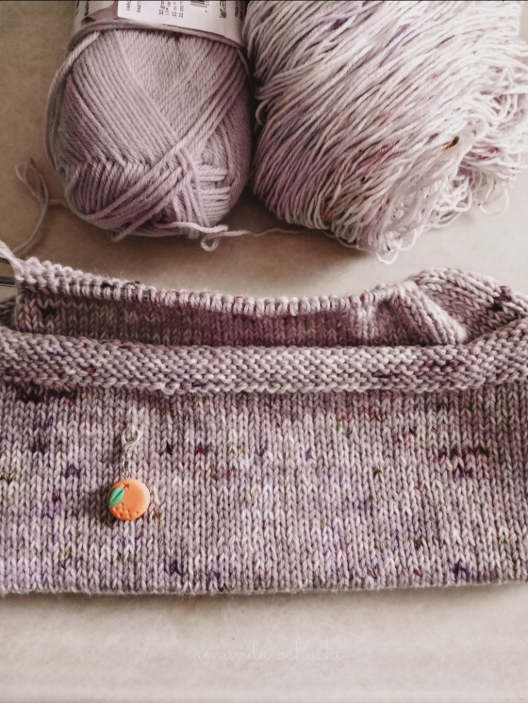 I’m holding two strands of fingering weight together (like the pattern suggests), but I’m using two different colors for a soft marled effect. Cute boring stuff happening here.