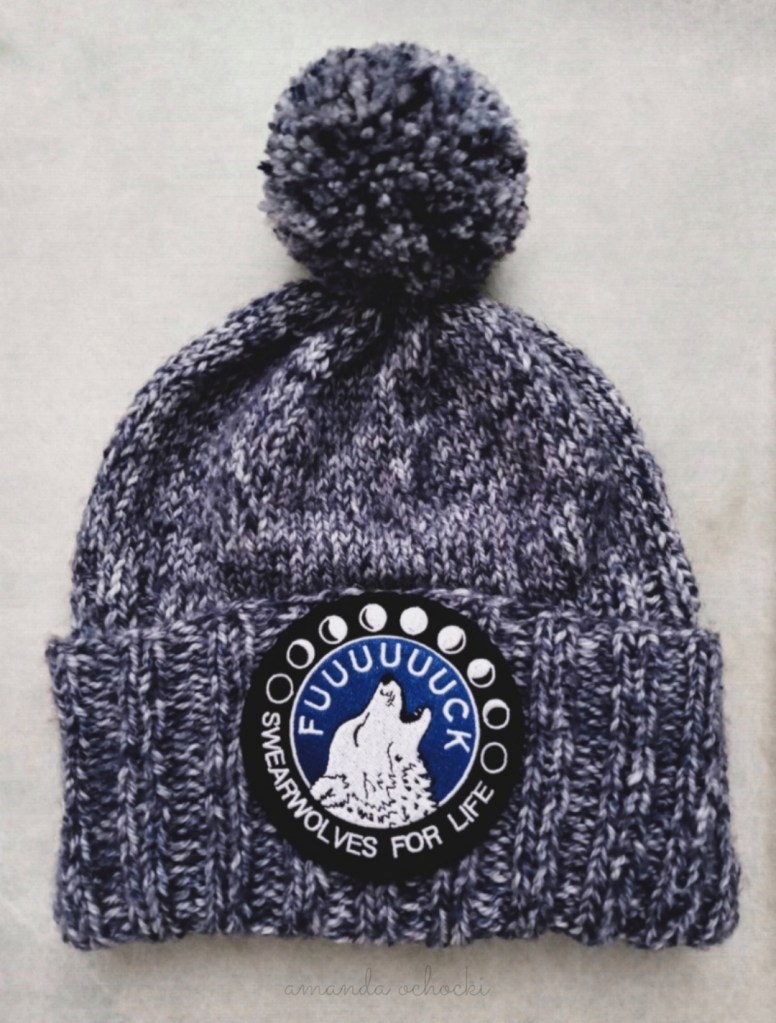 This is real life. I bought the Swearwolves patch from Timid Cryptids way back in 2018 and just now put it on a hat, the hat was one of my first knits (also from way back when) that nobody loved, but now it fits the mood so much better.
