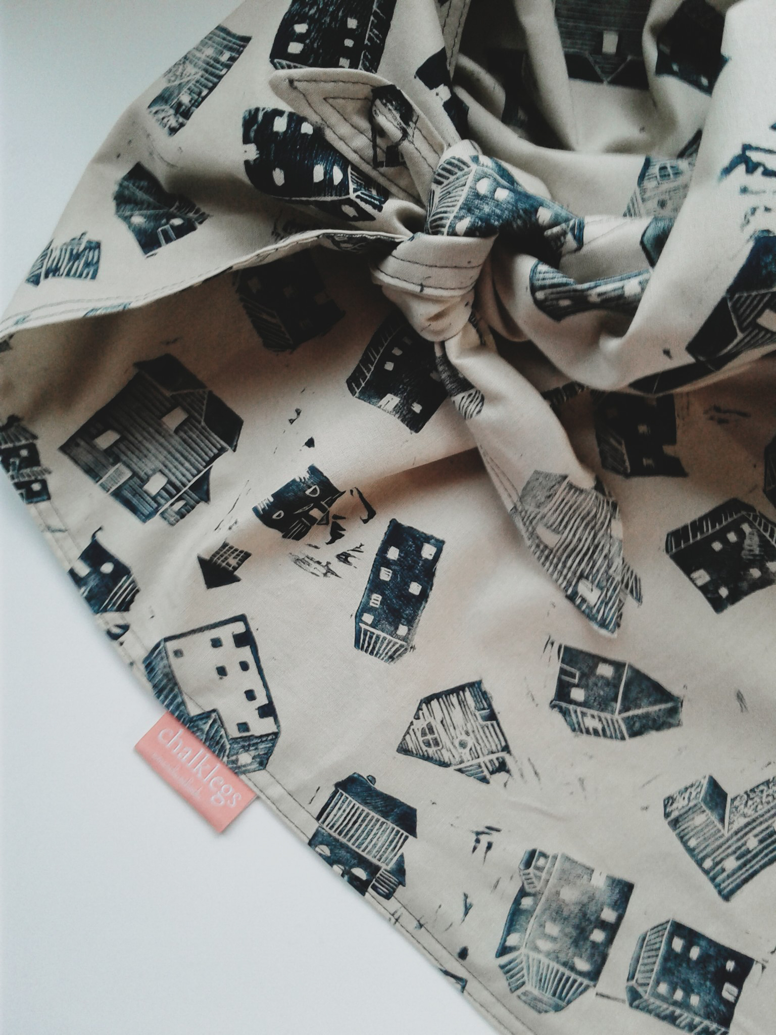 A kerchief sewn from fabric Lex block printed for me, I can spot the 1900 house and our old westside apartment. ♡