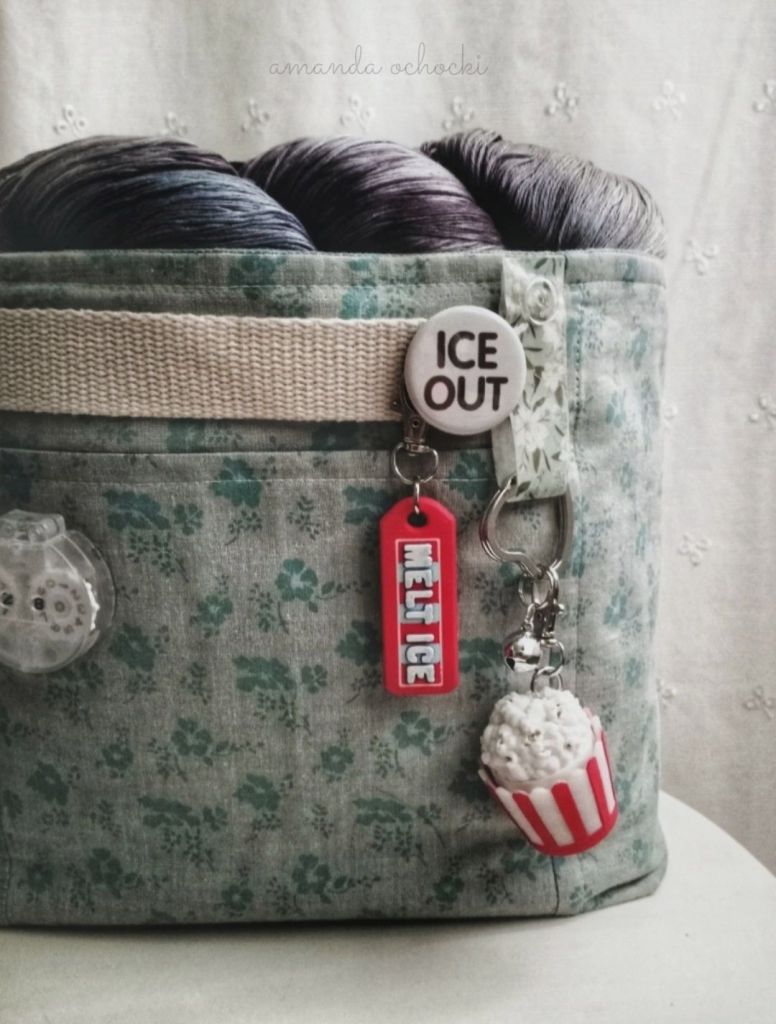 Ok, most known for my bags? My charms, my cute stuffs? I sewed this tote bin for sitting on my dedicated project shelf, it’s perfect for lugging around. Both sides have a simple outter pocket while the inside has a more custom pocket layout with spaces for patterns, pens, pencils and all my notions. It’s roughly H=8″ x W=9½” x D=6″.