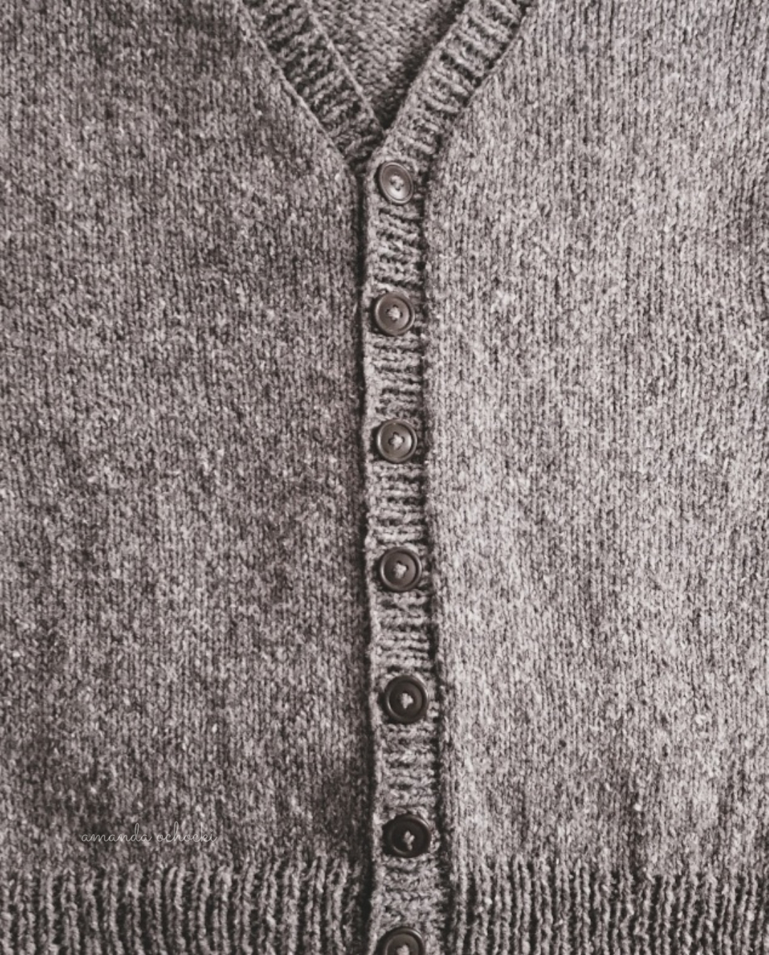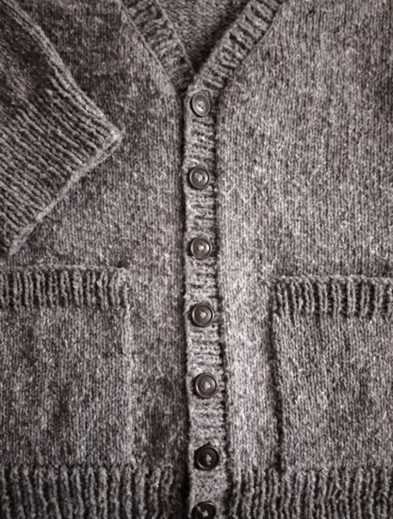 Afterthought patch pockets as follows: Leaving a long tail, pick up 29 sts just above the bottom ribbing, and roughly 10 stitches (or desired distance) away from the button band, knit 35 rows in stockinette, then work 1×1 ribbing for 7 rows, bind off all sts, again leaving a long tail, stitch down pocket sides using tails. Repeat for other side.