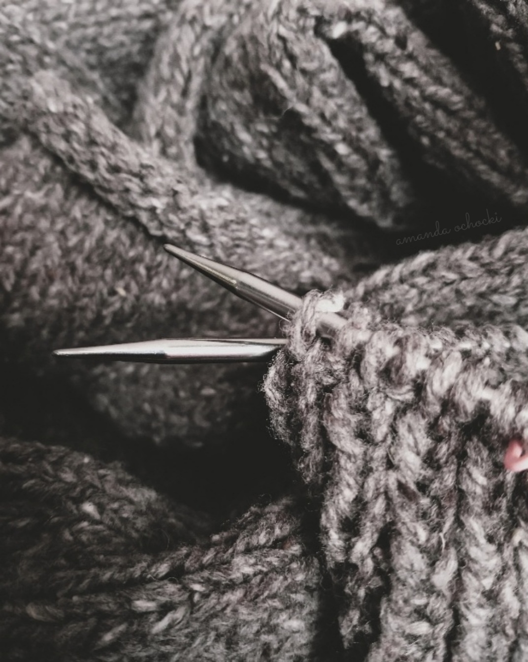 Worsted weight sweater = tired arms = put it in a bag to help hold it and then stuff it in a “slippery” bag to help move it around on your lap.