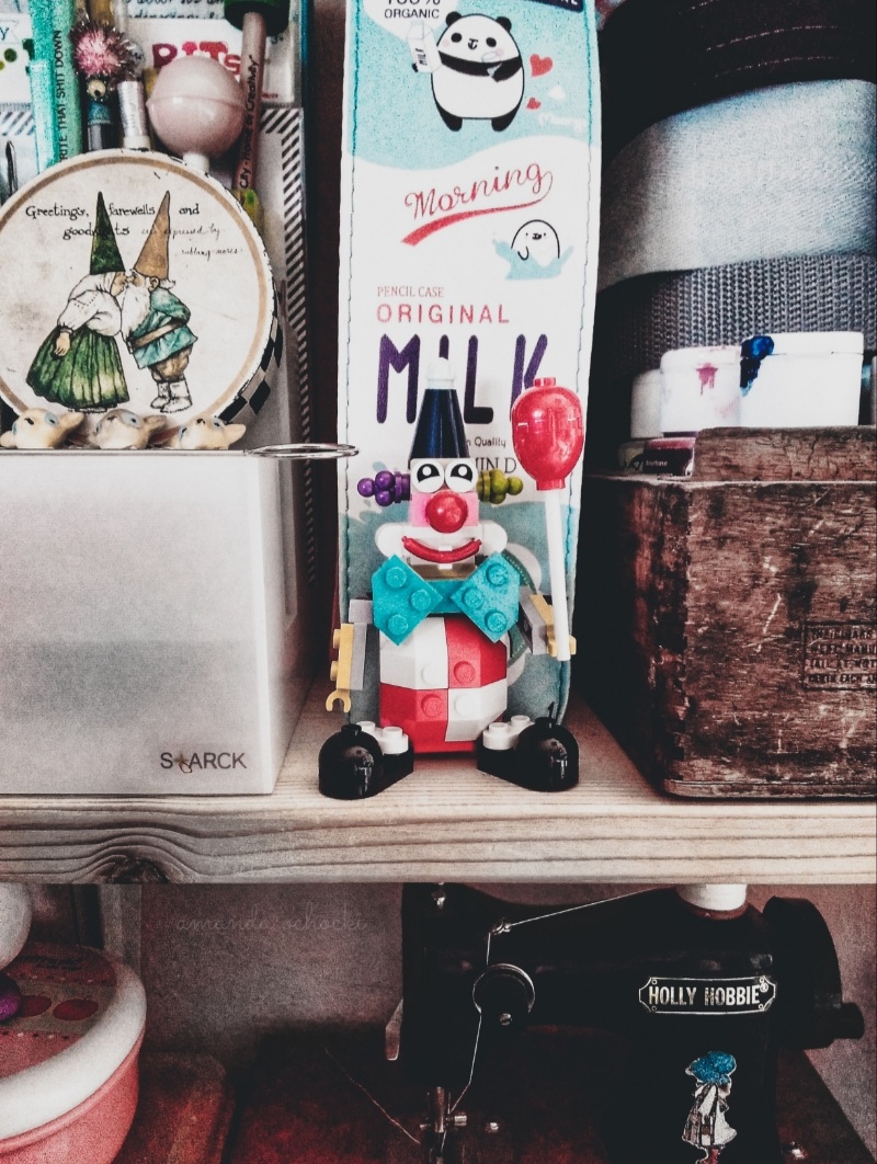 Jason built me a blocky clown with a hotdog smile, honestly the Lego stuff never makes its way upstairs, but everyone hated this little weird guy except me.♡