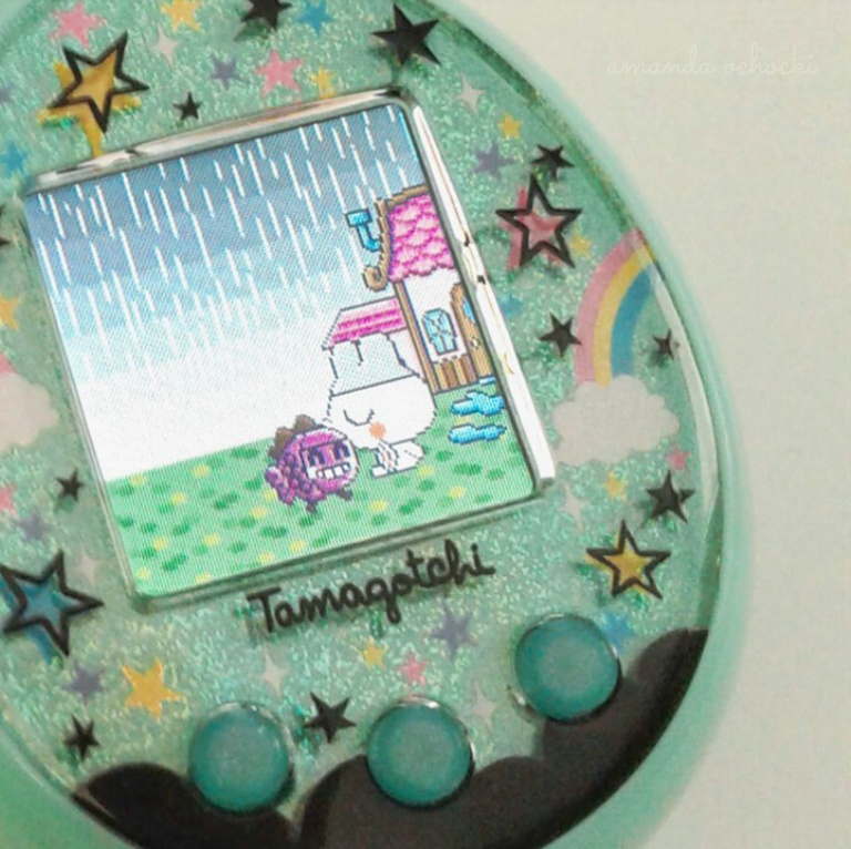 This is my Tamagotchi On, Magic edition and that’s my Mametchi tama kissing his super happy grape fish in the rain and I might be feeling 12 years old right now. ♡