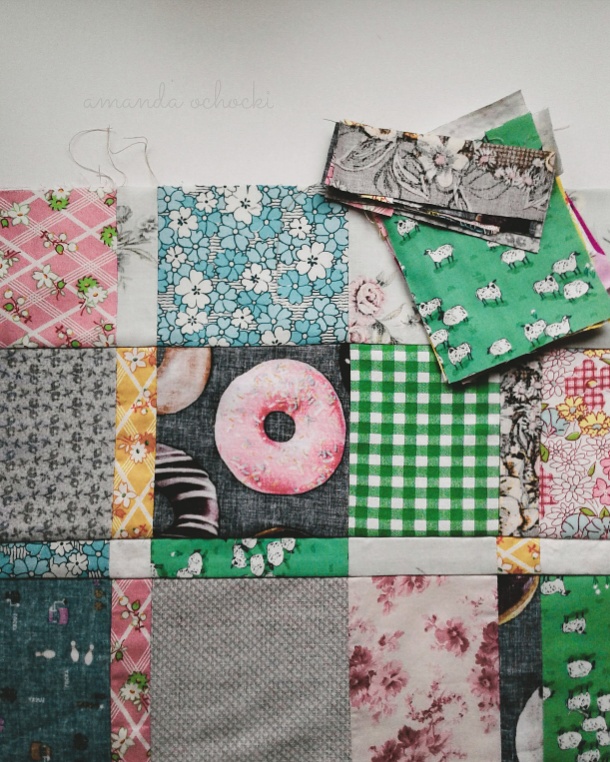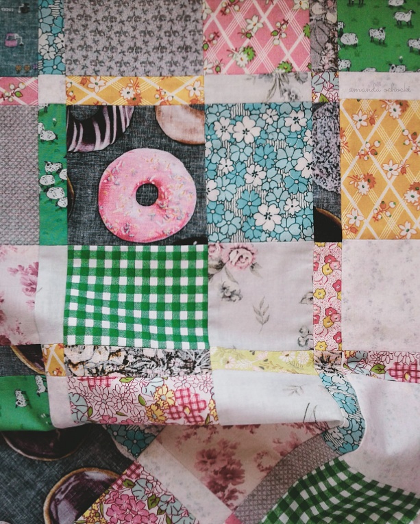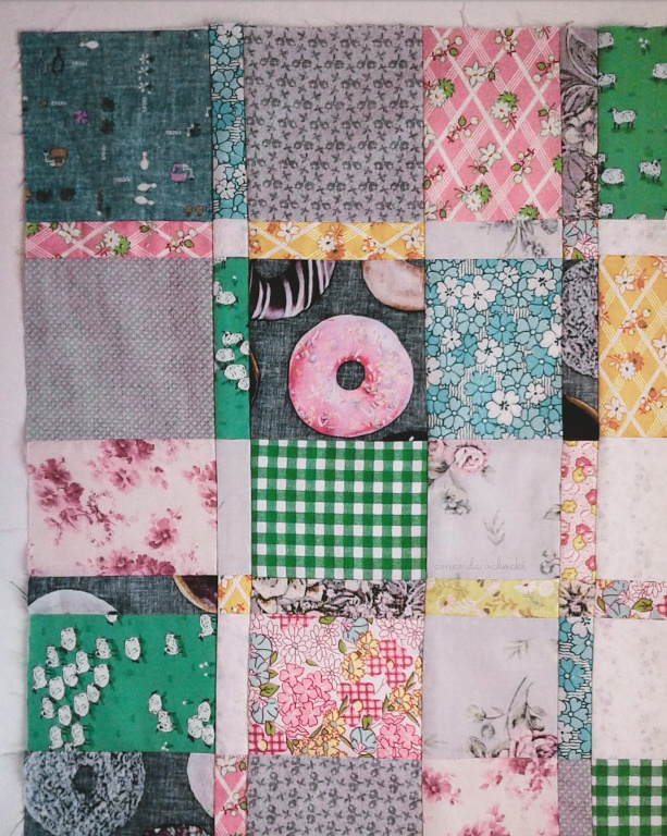 Building up little scrappy blocks row by row, making some Plaidish Quilt yardage in gingham, doughnuts and flowers ..listed in no particular order, because if it were in order of favorites, doughnuts would absolutely be first. To be specific, old fashion glazed, followed by powdered cake.